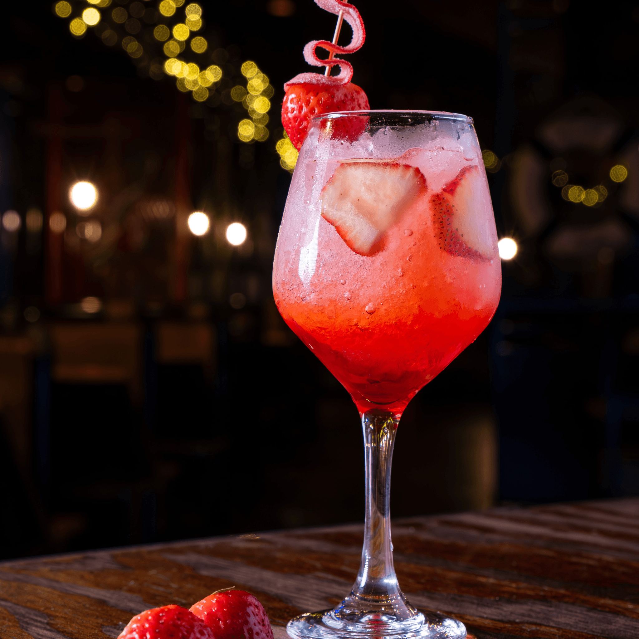 A vibrant fusion of sweet grenadine and fresh strawberries, served over crushed ice for the perfect texture, topped with refreshing Sprite, and finished with a playful gummy garnish.