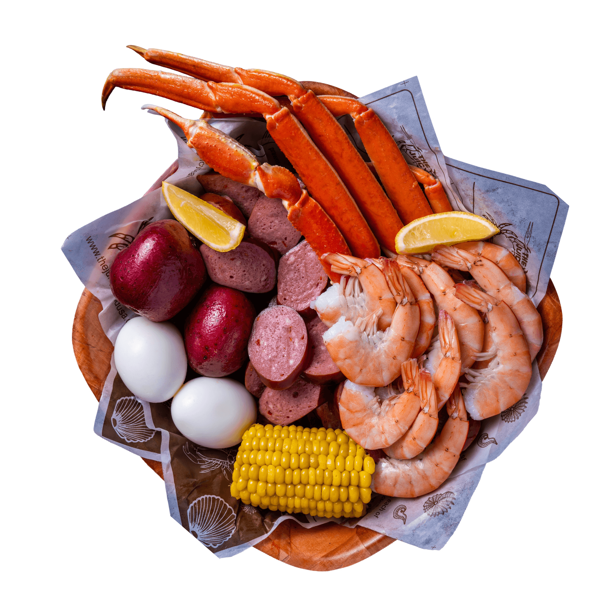 1 cluster of snow crab and your choice of two different items. Served with 1 egg, 1 corn and 2 potatoes