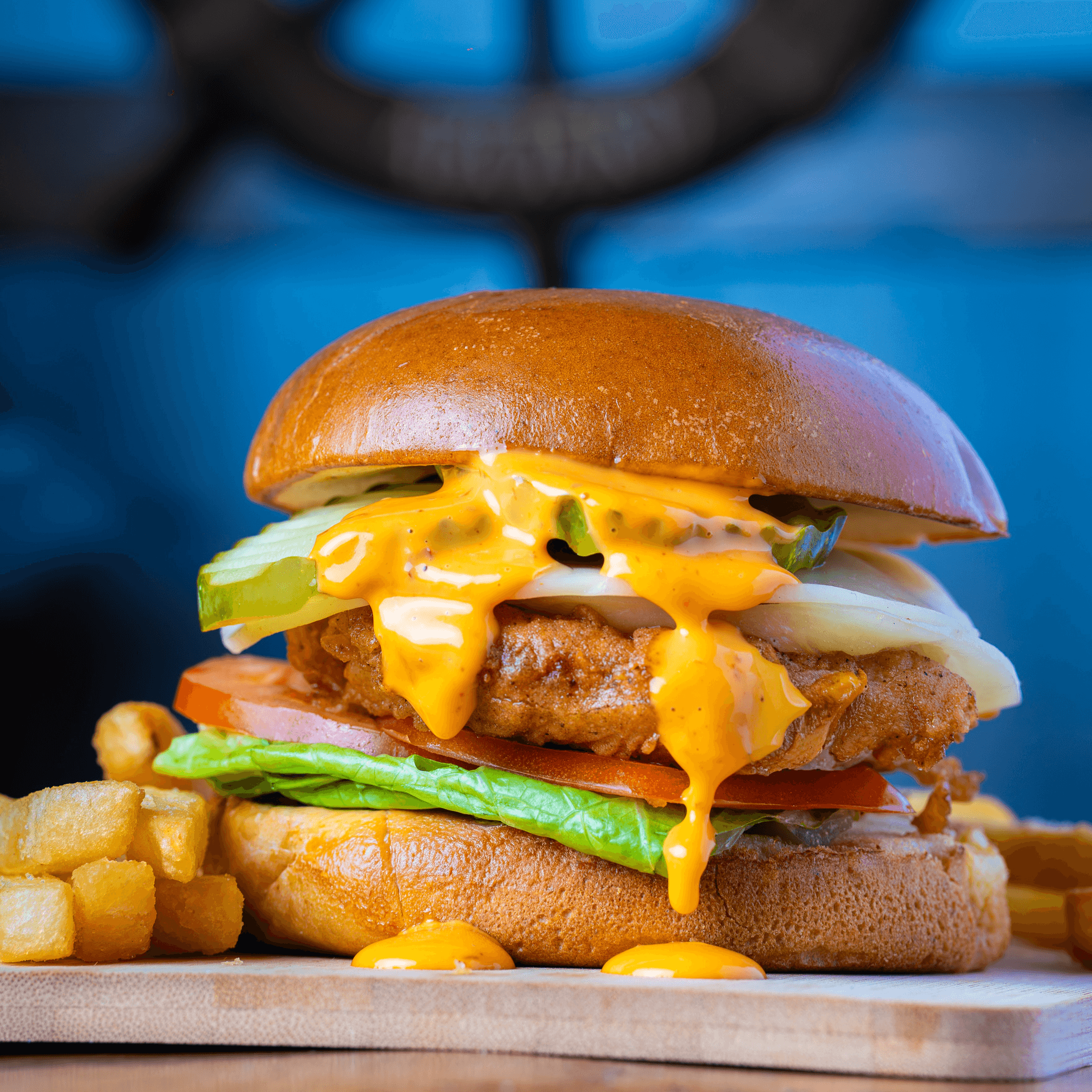 Juicy chicken sandwich stacked with fresh Romaine lettuce, juicy tomato, crunchy pickles, and smooth provolone cheese, draped in our house-made Boom Boom Sauce and served on a warm toasted bun.