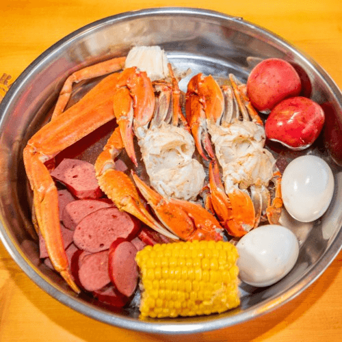 1 LB Snow crab Legs 1/4 LB Sausage 2 Eggs, 1 Corn & 2 Potatoes