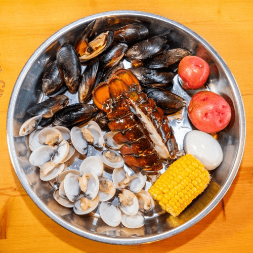 1 1/2 lb snow crab legs, 1 lb shrimp (no head), 1 lb lobster tails, 1 lb dungeness crab, 1/2 lb sausage, 3 corns and 6 potatoes