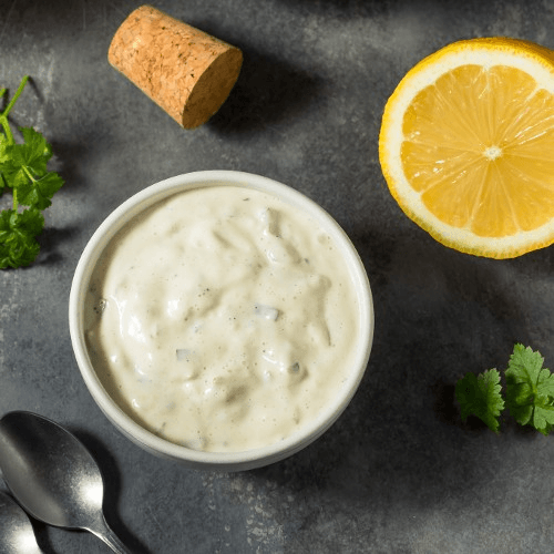 Fried catfish fillet with tartar sauce lettuce and tomato