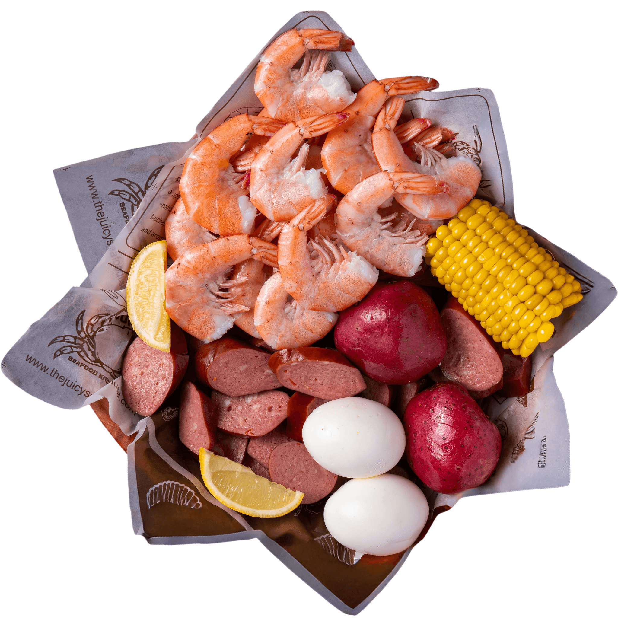 0.5 pound shrimp (no head), 0.5 pound snow crab leg, two eggs, one corn, two potatoes, 0.25 pound sausage