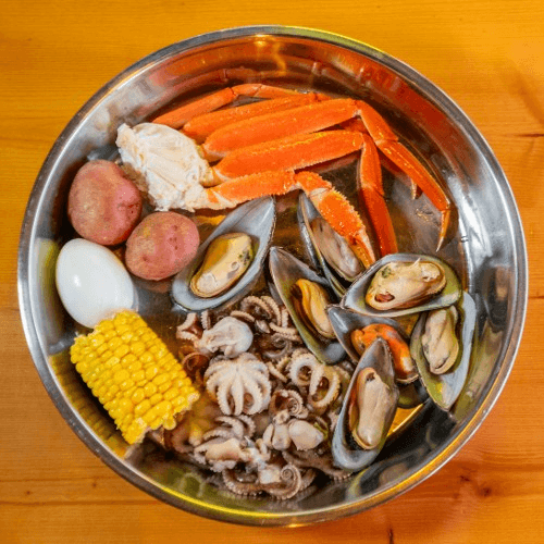 1/2 lb snow crab legs, 1 lb shrimp (no head), 1 lb Dungeness crab, 1/2 lb sausage, 2 corn and 4 potatoes