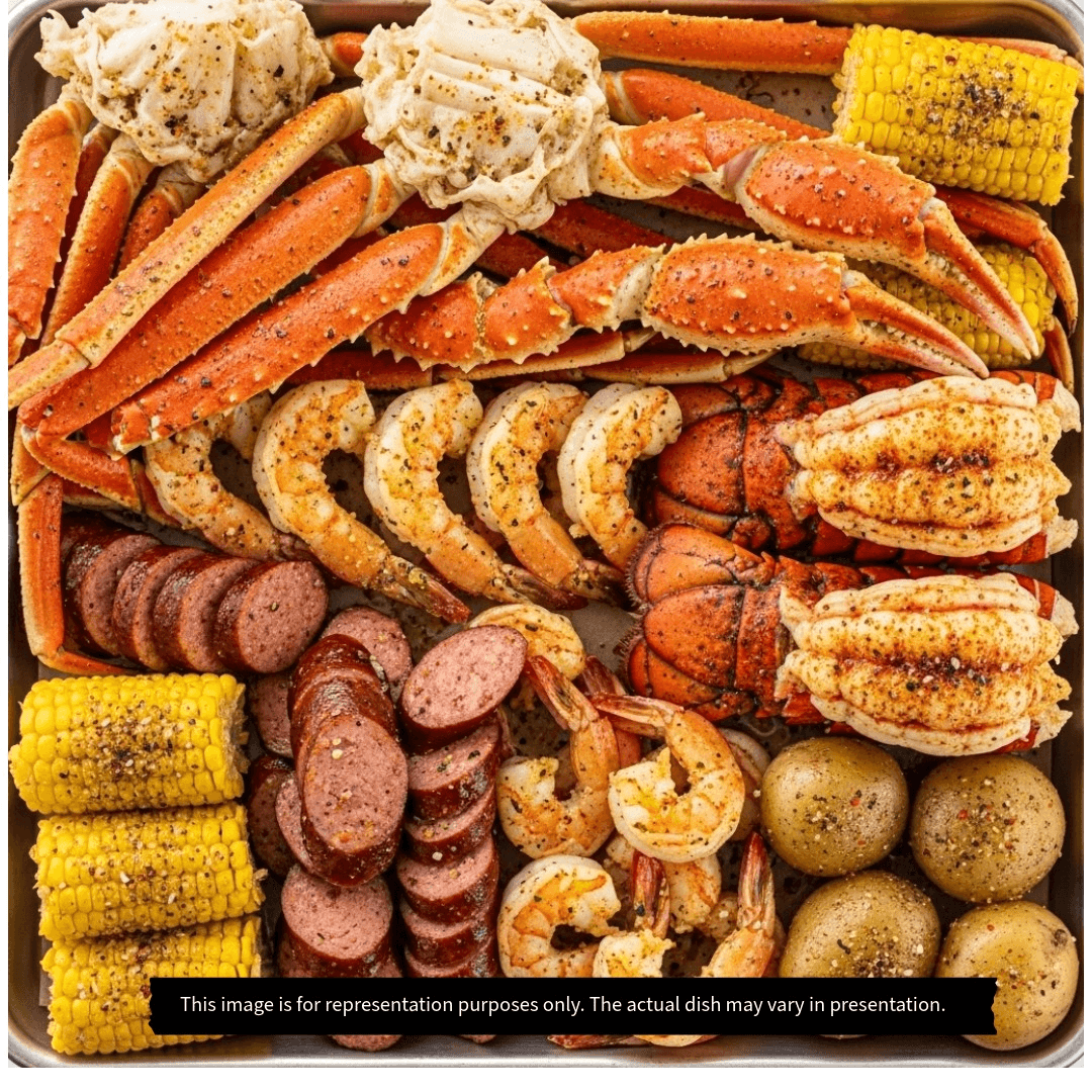 1 lb snow crab legs, 1 lb shrimp (no head), 1 lb king crab legs, 1 lb lobster tail, 1 lb sausage, 4 corns and 8 potatoes