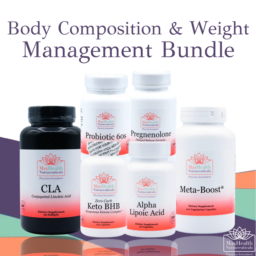 The Body Composition & Weight Management Bundle helps reduce body fat, increase lean muscle, support normal blood sugar levels, and may help to control healthy hormones which effects mood. Other benefits include enhanced metabolism for faster weight loss and helps to promote abdominal fat burn. Finally, the supplements in this weight management bundle may also promote energy, endurance, and focus.