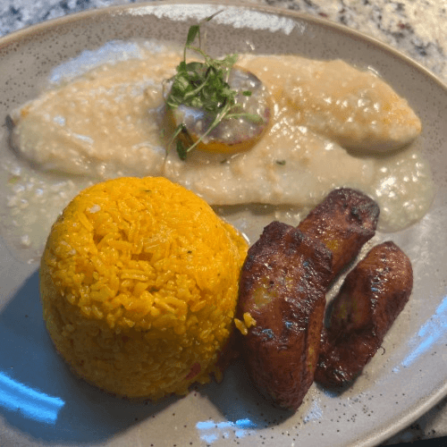 Chicken breast, butterflied and marinated with citrus juice and mojo sauce, grilled and topped with grilled onions. Served with rice, black beans, and sweet plantains