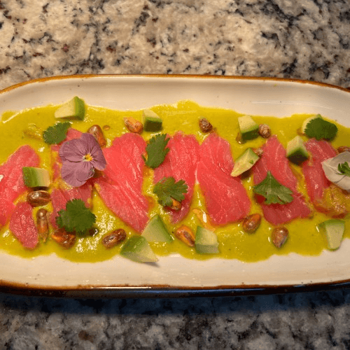 Yellowfin Tuna, shrimp, Nikkei leche de tigre, red onions, avocado, toasted sesame