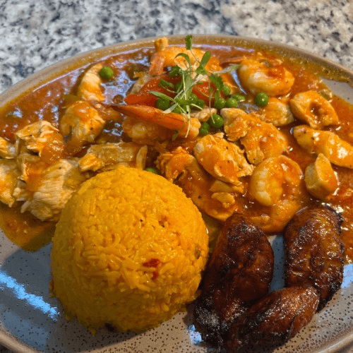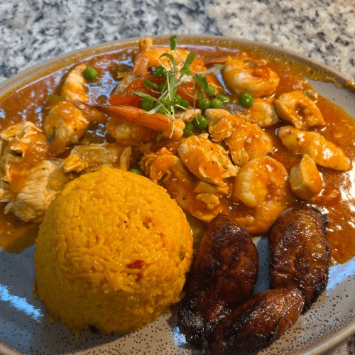 Chicken breast pieces and shrimp sautéed in a spicy tomato creole sofrito sauce with peppers, onions, and white wine. Served with rice, black beans, and sweet plantains