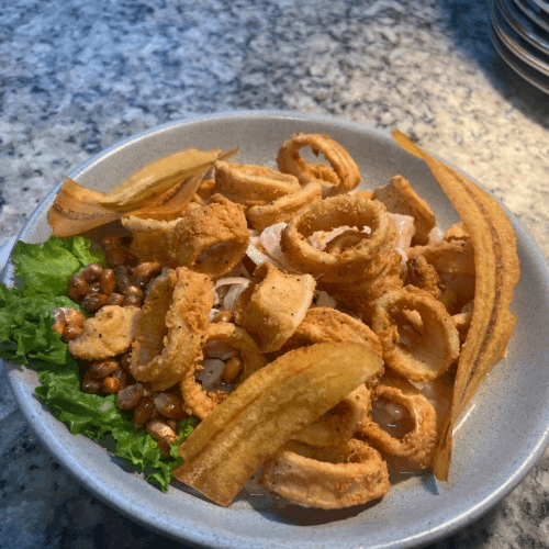 Fish ceviche, fried calamari, classic leche de Tigre, red onions, crispy plantain, and sweet potato.