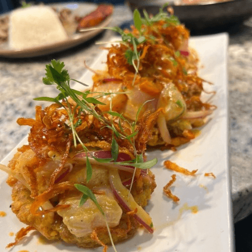 Fried green pressed plantain, Fish Ceviche in leche de tigre, crispy sweet potato.