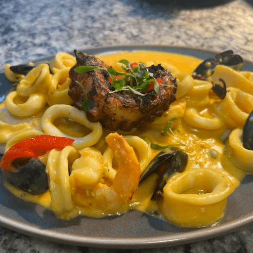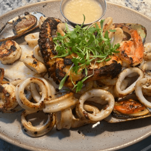 Grilled Grouper fillet topped with shrimp, calamari, and mussels sauteed in a delicate Peruvian yellow pepper sauce, Grilled Octopus.