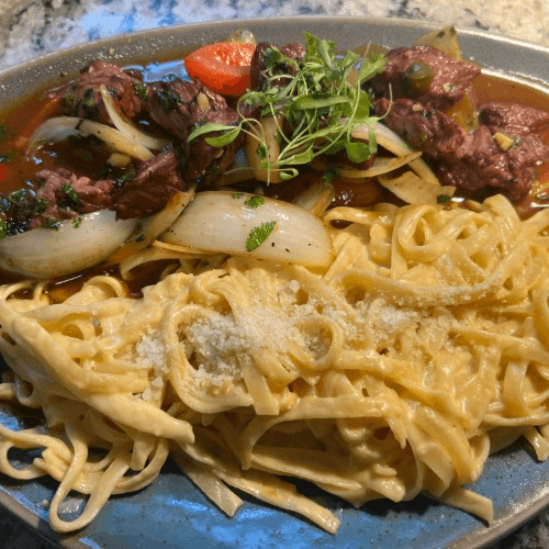 Our version of shrimp scampi. Fresh garlic, basil, white wine, a dash of cream, and Parmigiano cheese sautéed with fettuccine and grilled garlic shrimp