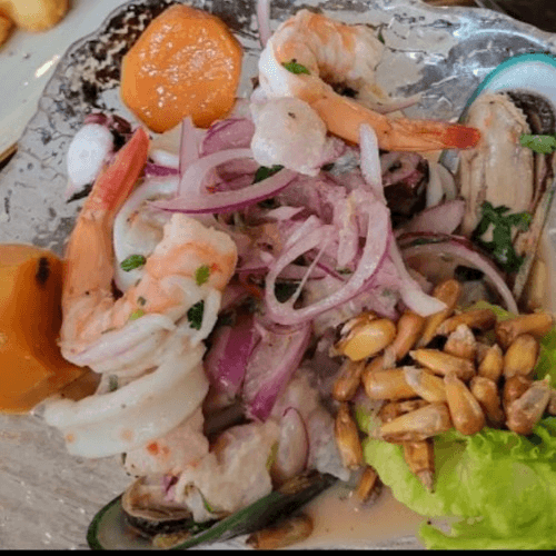 Fish, shrimp, octopus, calamari, green mussels, classic leche de tigre, red onions, concha, and sweet potato.