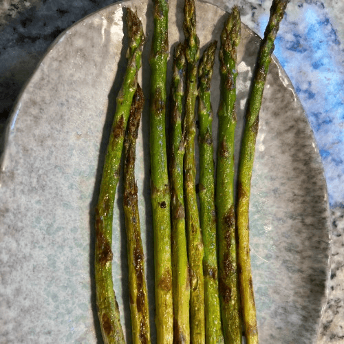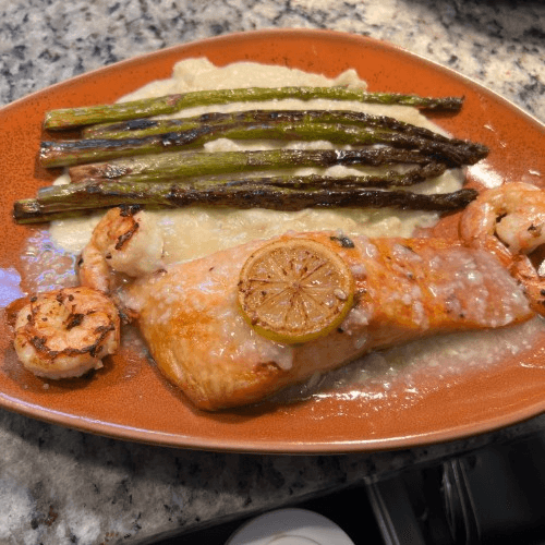 Chilean salmon fillet and Gulf Coast shrimp grilled, lite garlic butter sauce, garlic yucca mash, and grilled asparagus