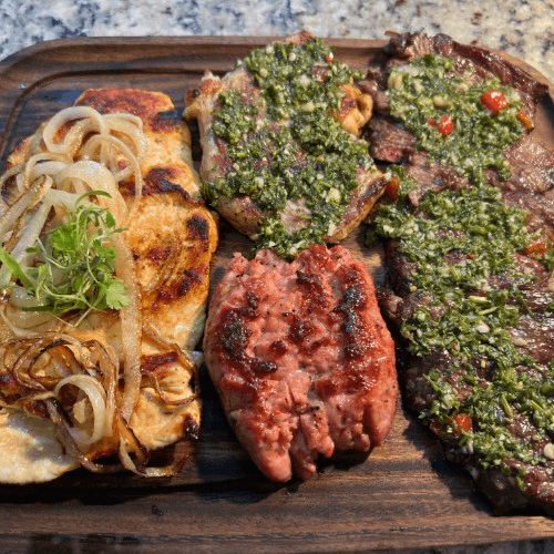 Certified tender Black Angus skirt steak, mojo chicken breast, Angus beef bone-in short ribs, Argentine sausage, and sides will be served with a choice of rice and a choice of House green or Caesar salad.
