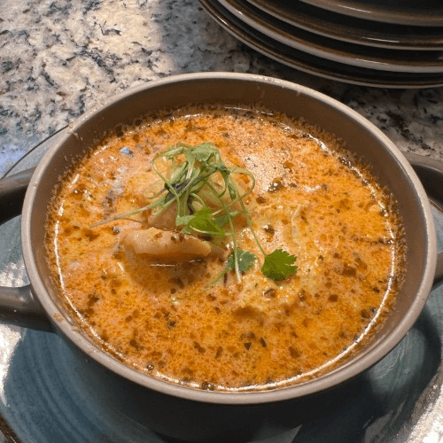 Peruvian steamed fish stew, white and green onions, plum tomato, cilantro, garlic, Aji Amarillo