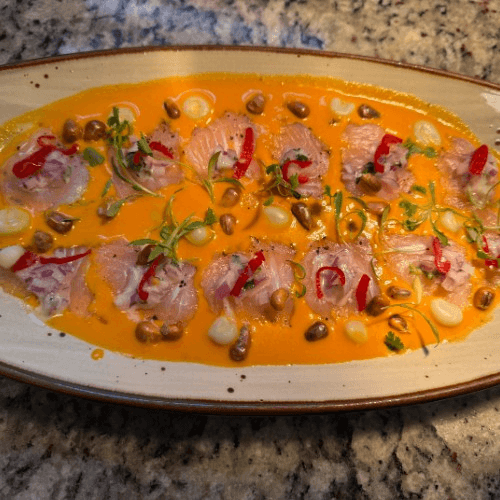 Sashimi Grouper fine cuts over yellow pepper cream emulsion, chalaquita red onions, fine herbs, charred sweet potato, and cancha.