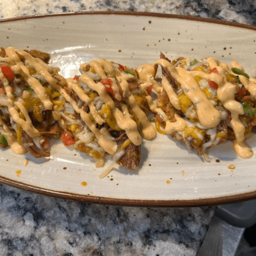 Fried green pressed plantain, ropa vieja beef or shrimp enchilada, shredded cheese, pico de gallo, and romesco aioli