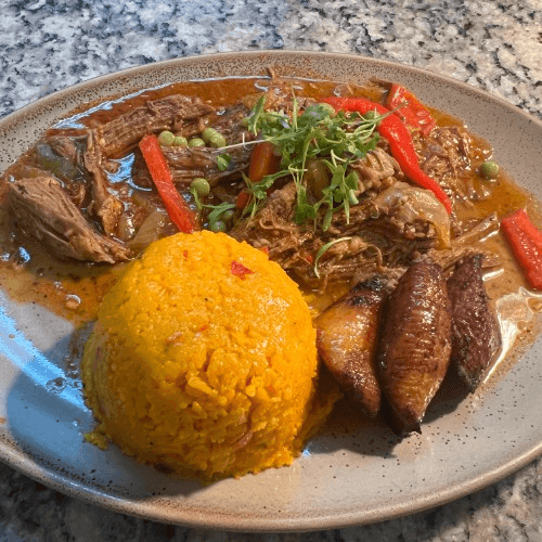 Cuba’s National dish. Braised Flank steak pulled tender, slowly simmered with onions and bell peppers in a delicate plum tomato sauce. Served with rice, black beans, and sweet plantains.