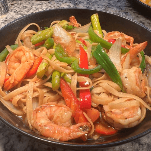 Peruvian-Cantonese style lo mein, onions, scallions, roma tomato, bell peppers, soy sauce, sesame oil, fettuccine, and sautéed in a fiery wok