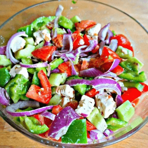 Lettuce, tomatoes, onions, cucumbers, green peppers, olives, pepperoncini.