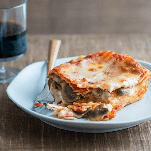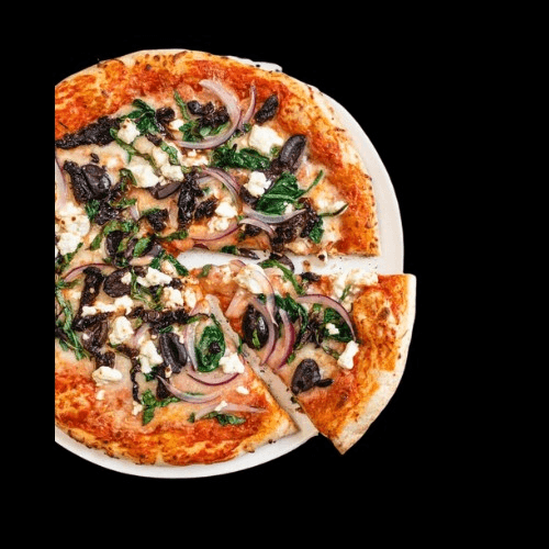 Gluten-free crust, Alfredo sauce, vegan mozzarella cheese, mushrooms, onions, tomatoes, spinach & mild beyond sausage