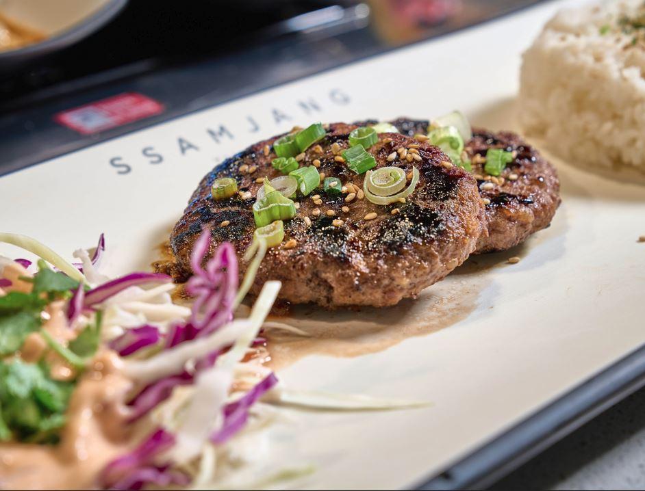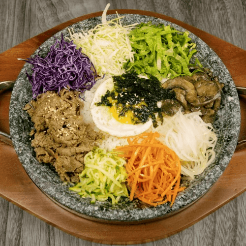 Rice with assorted fresh, marinated, and sautéed vegetables and beef served in heat-safe stone bowl
