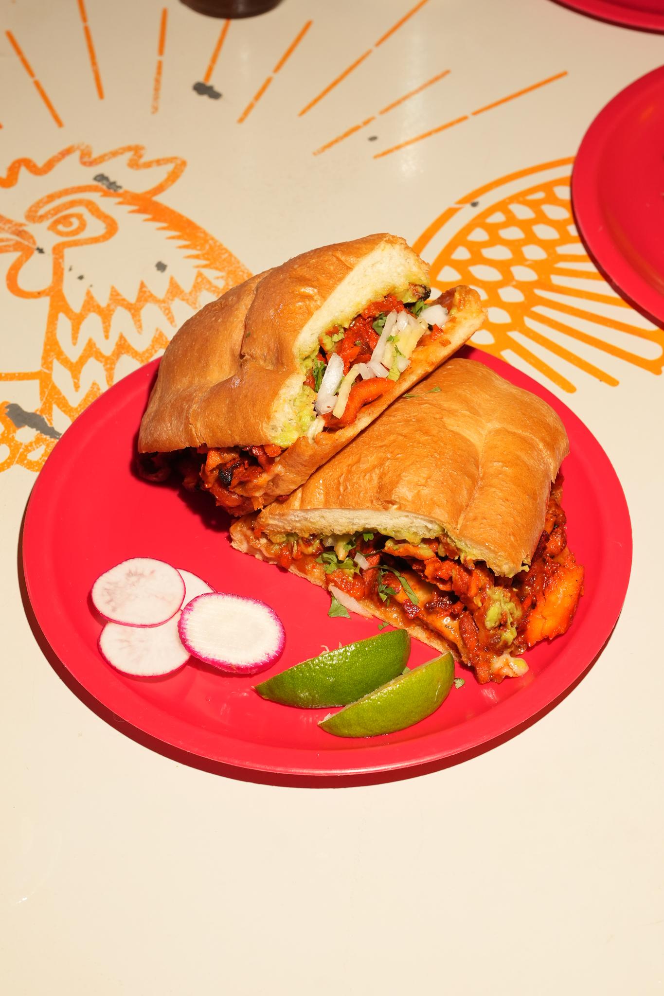 A toasted mexican telera roll filled with marinated pork, guacamole, chihuahua cheese, cilantro, onions, and house salsa. Hearty, flavorful, and loaded with bold, satisfying bites