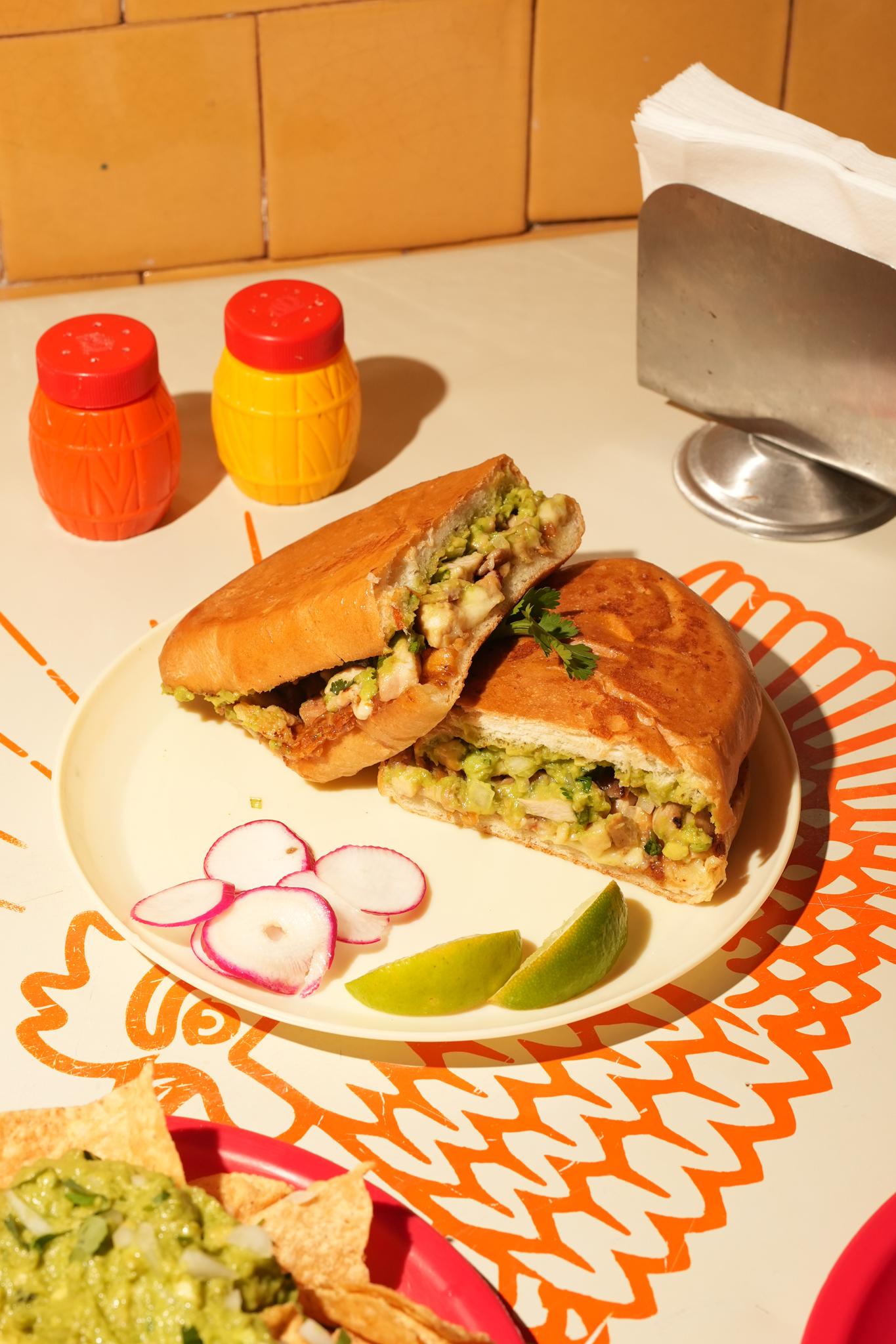 A toasted mexican telera roll filled with juicy chicken, guacamole, chihuahua cheese, cilantro, onions, and house salsa. Hearty, flavorful, and loaded with bold, satisfying bites