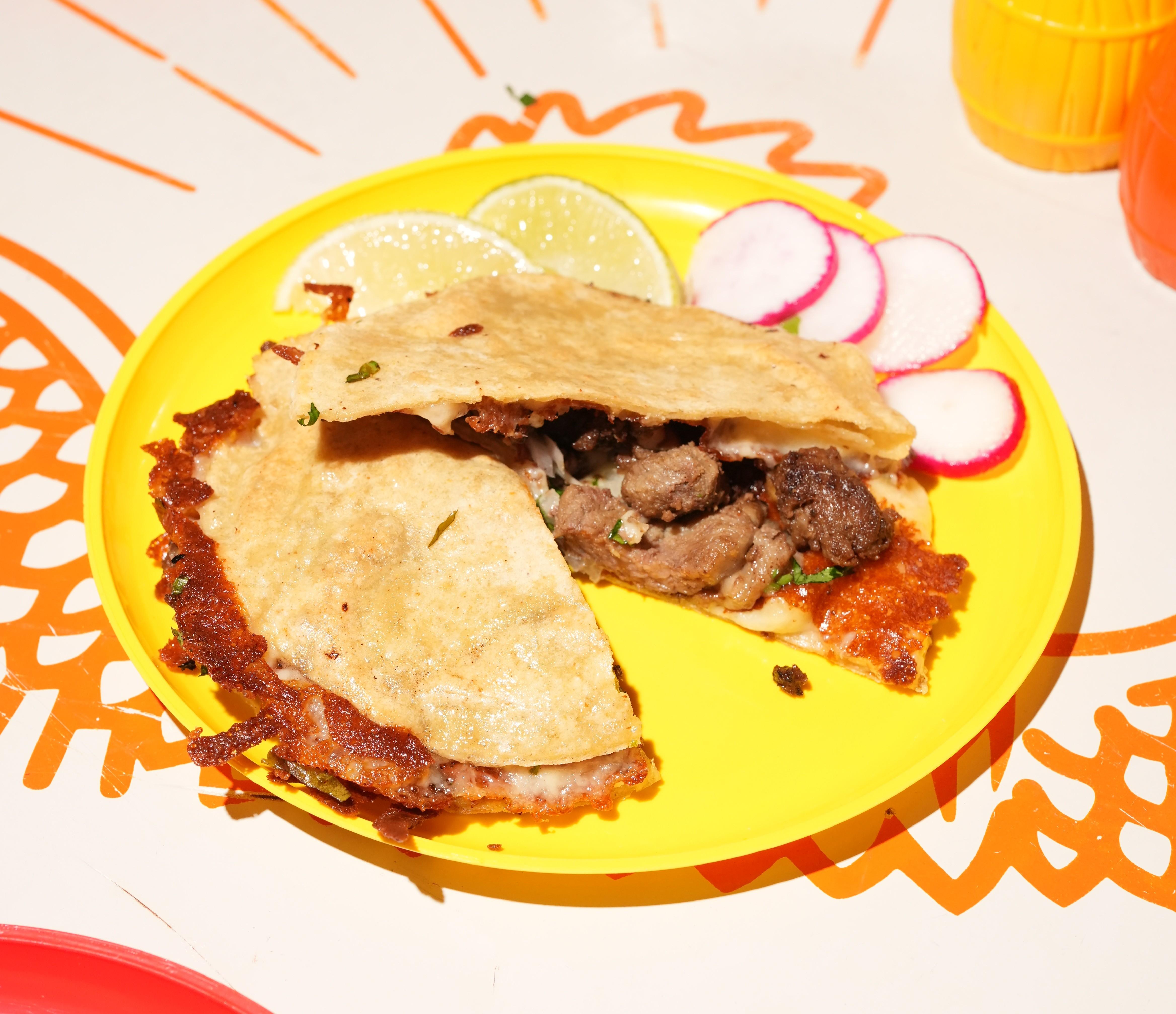 Two corn tortillas grilled with melted chihuahua cheese and steak. Finished with fresh cilantro, diced white onion, and house salsa. Crispy on the outside, cheesy and bold on the inside