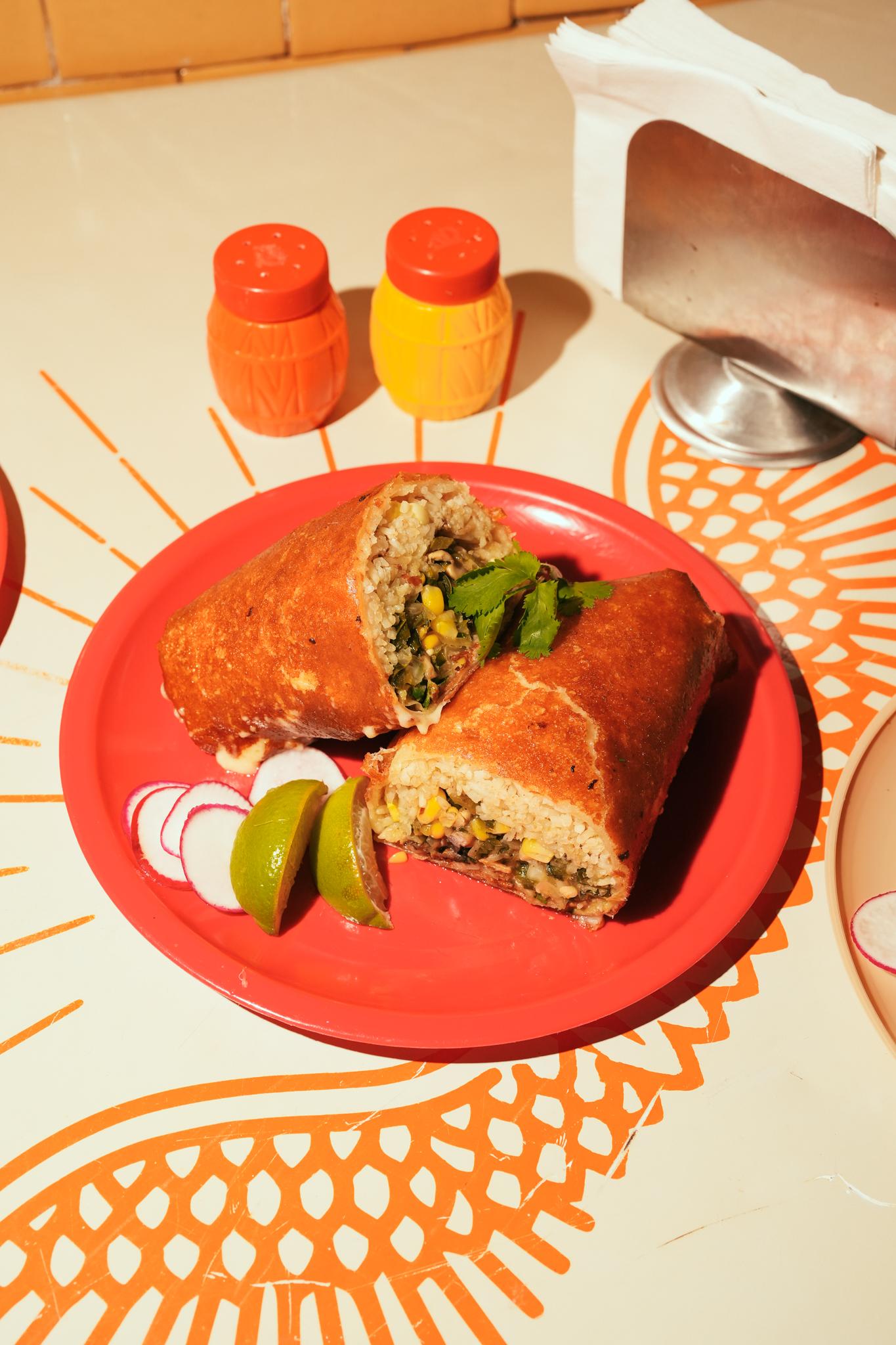 A flour tortilla wrapped in a crispy shell of crusted chihuahua cheese, filled with rice, mushrooms, sweet com, peppers, fresh cilantro, diced white onion, and house salsa
