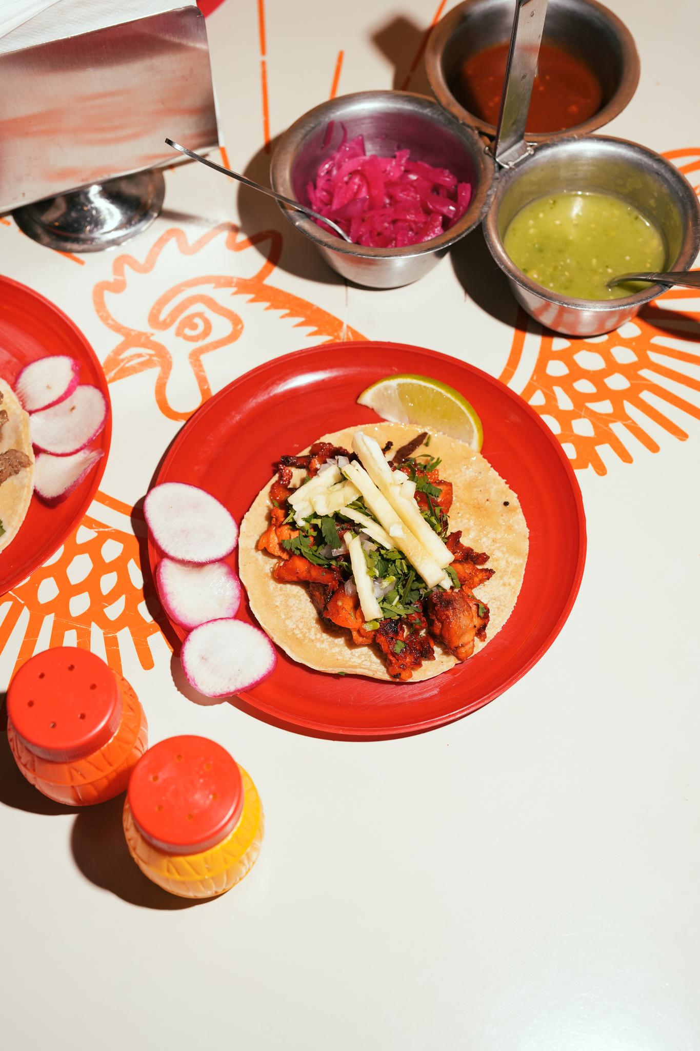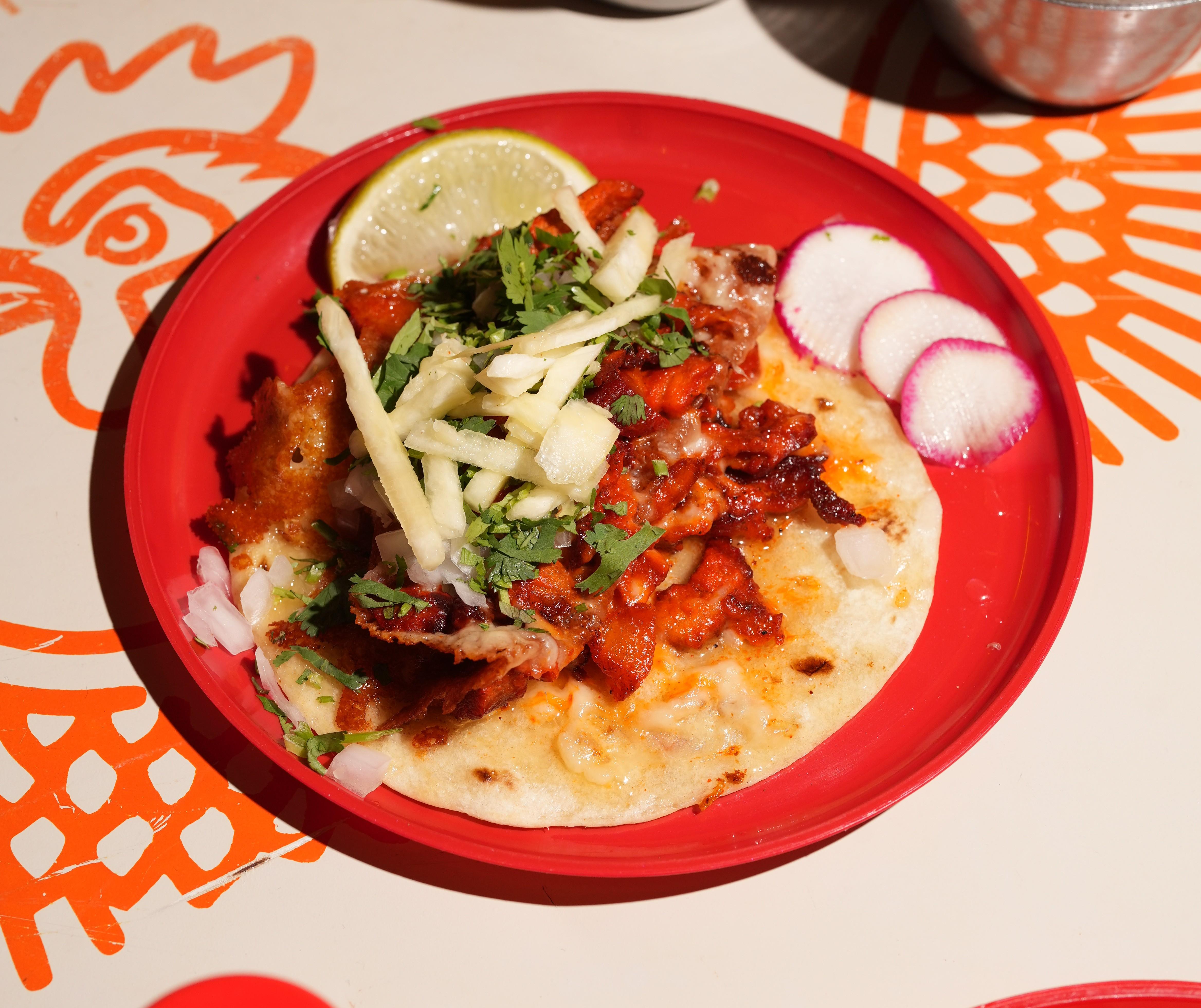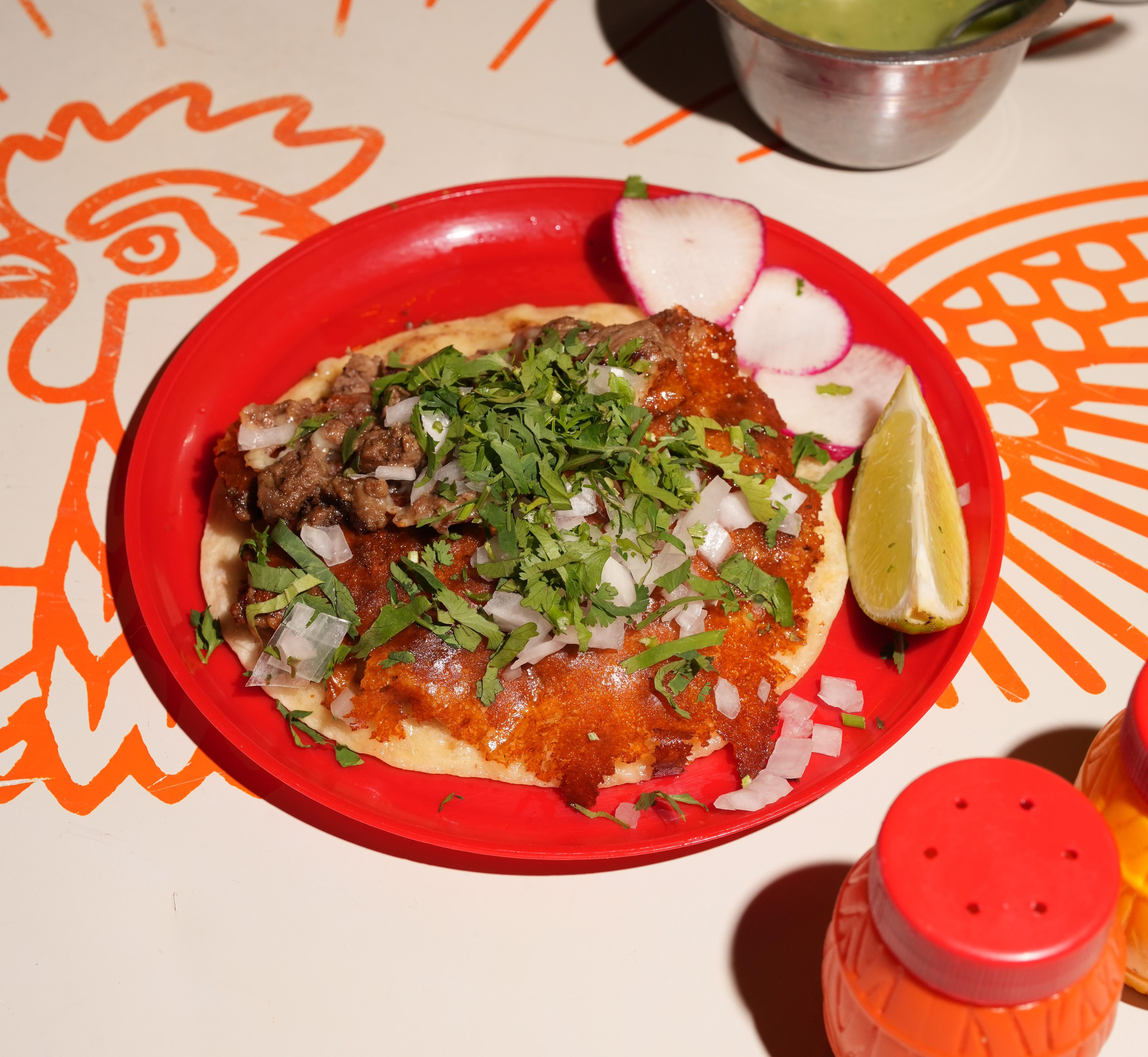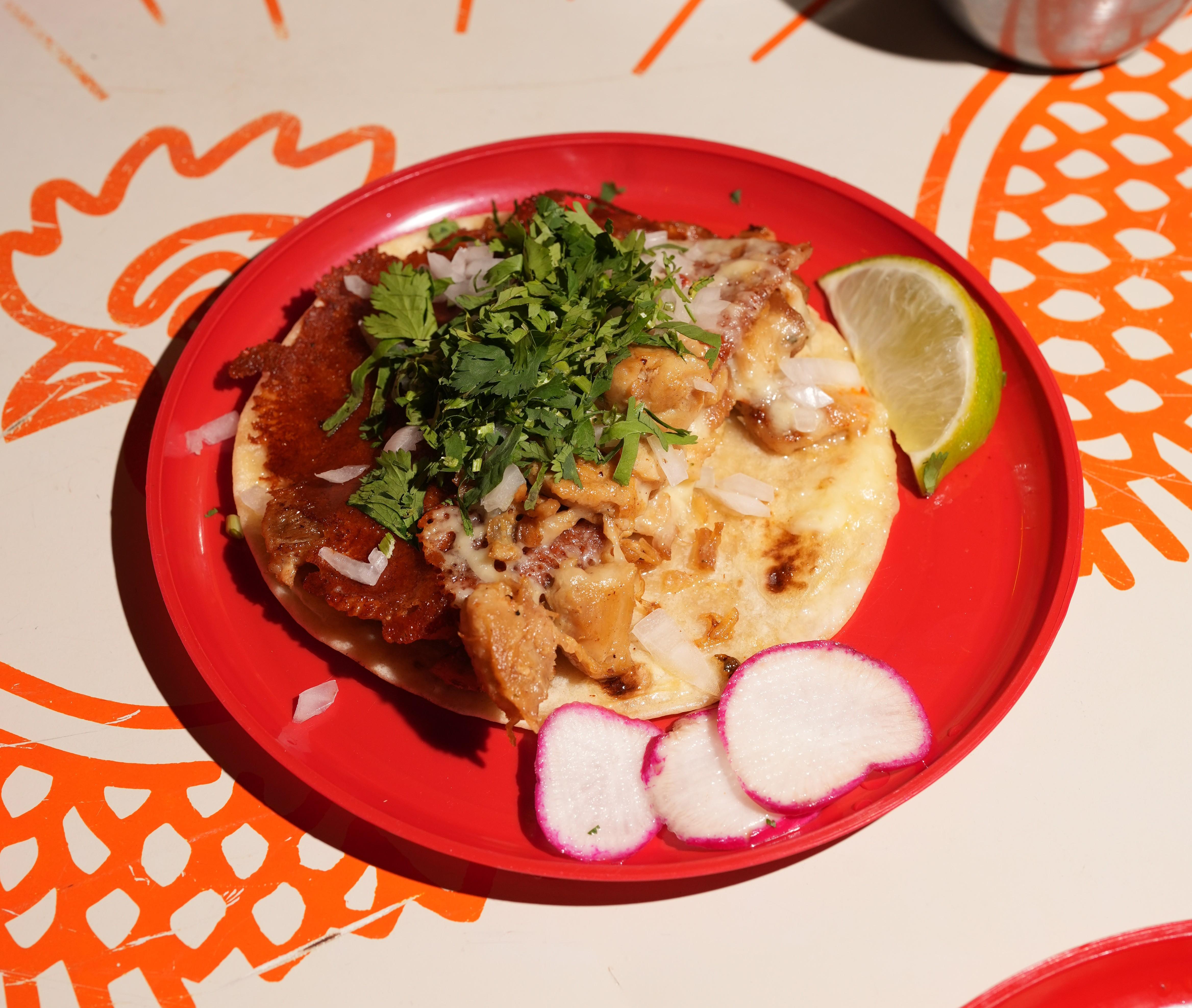 Two corn tortillas grilled with melted chihuahua cheese and marinated pork. Finished with fresh cilantro, diced white onion, and house salsa. Crispy on the outside, cheesy and bold on the inside