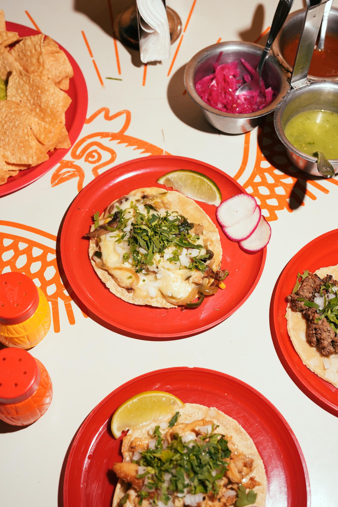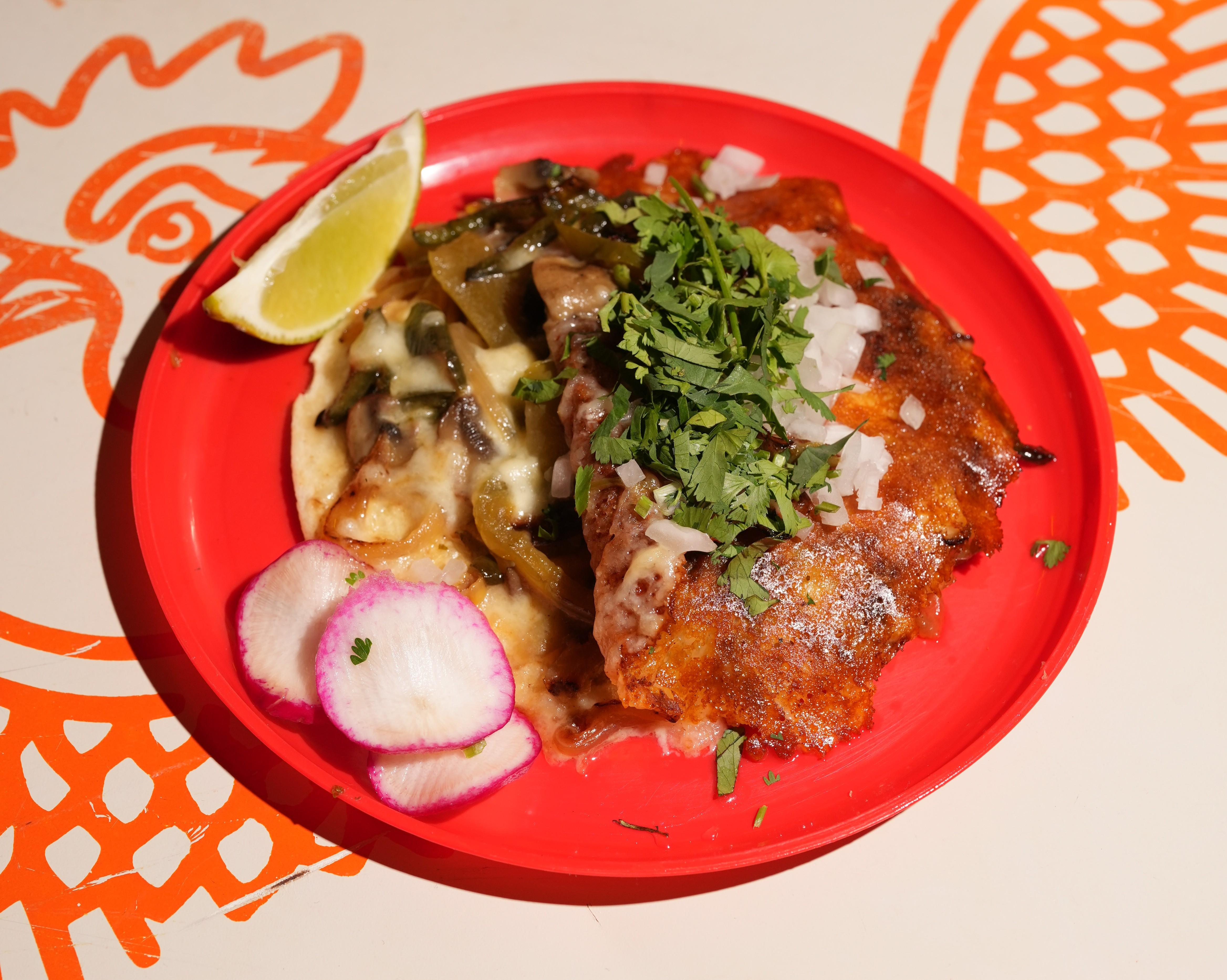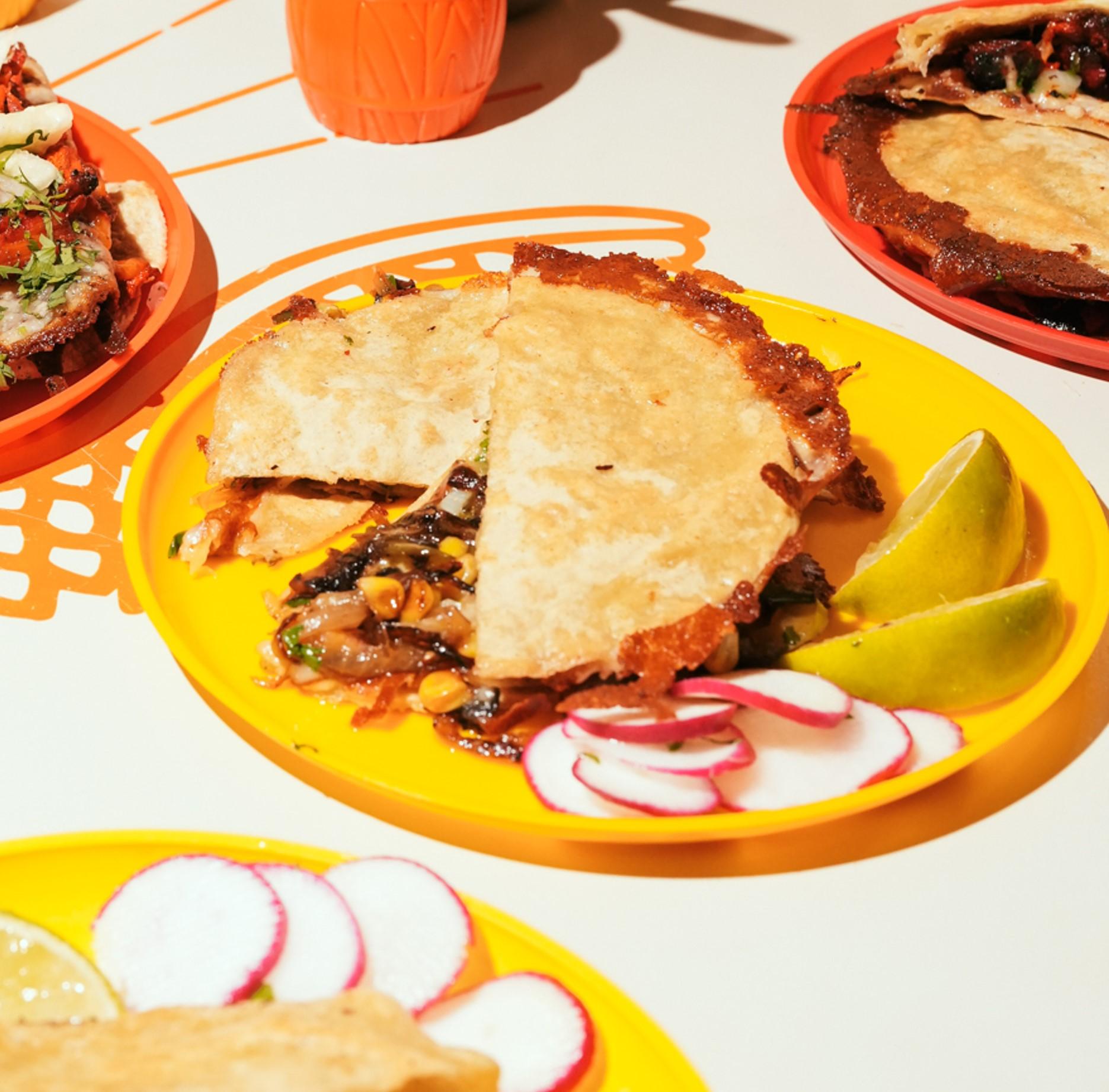 Two corn tortillas grilled with melted chihuahua cheese and a mix of mushrooms, com, and peppers. Finished with fresh cilantro, diced white onion, and house salsa. Crispy on the outside, cheesy and bold on the inside