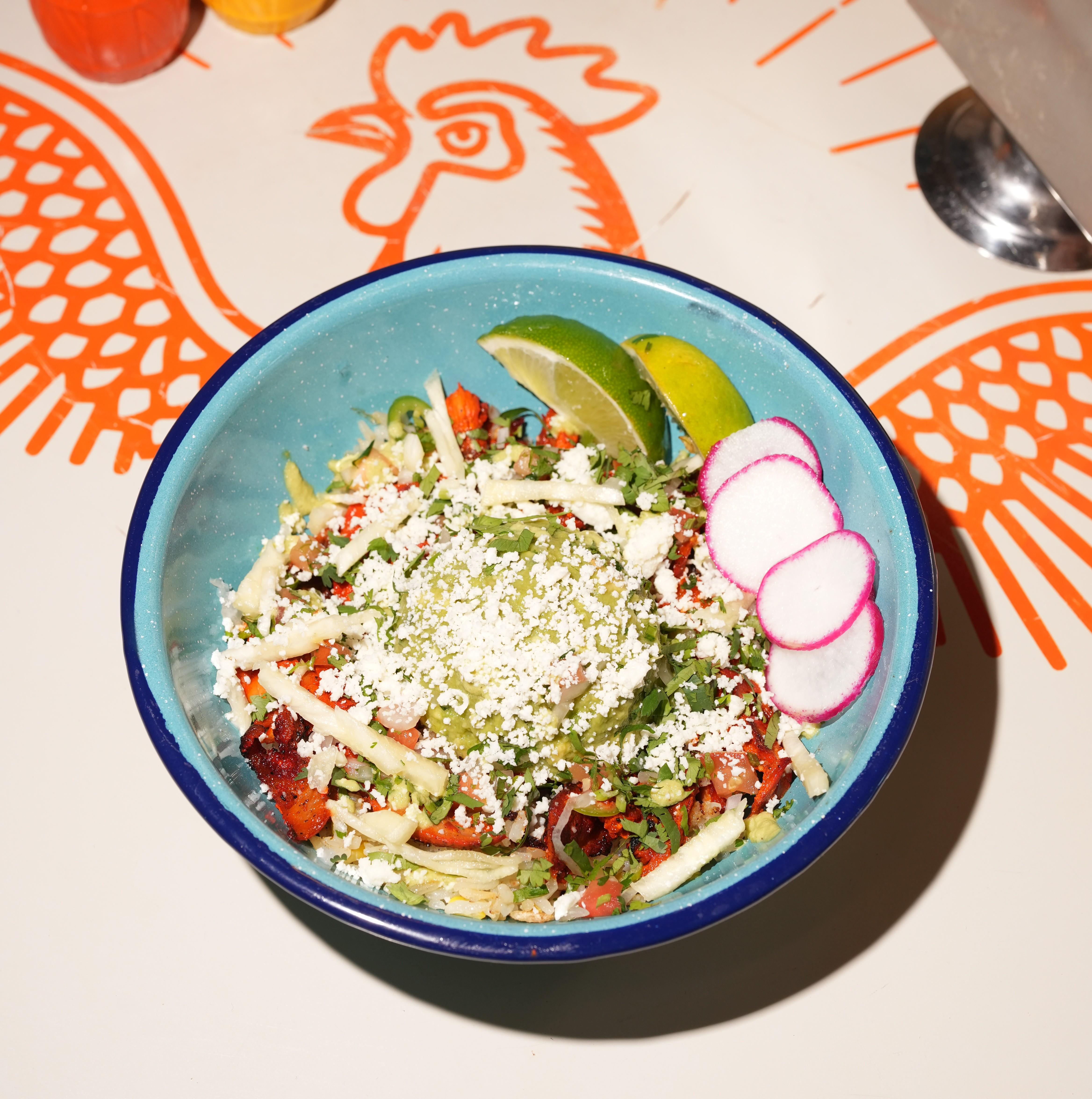 Juicy chicken piled over fluffy rice, topped with creamy freshly made guacamole, crumbled queso fresco, fresh cilantro, crisp onions, pico de gallo, and a drizzle of green sauce. No tortilla, all the flavor