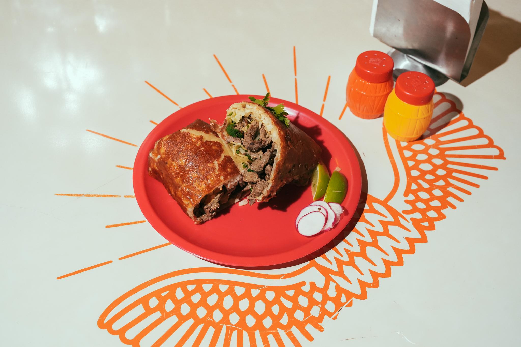 A flour tortilla wrapped in a crispy shell of crusted chihuahua cheese, filled with rice, steak, sweet corn, fresh cilantro, diced white onion, and house salsa