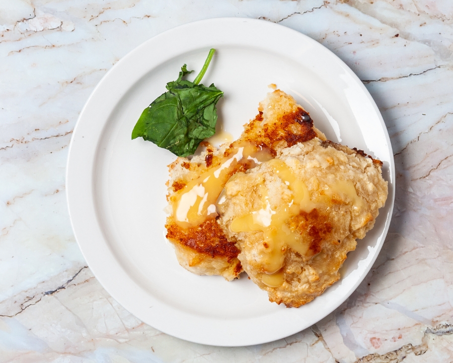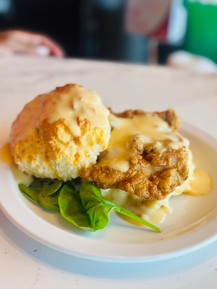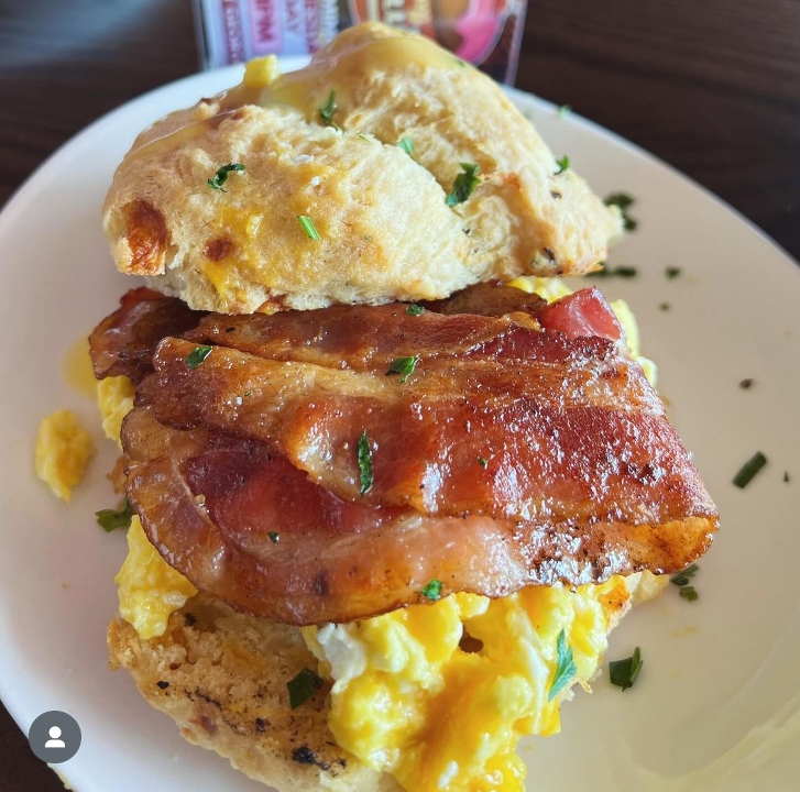 Open face buttermilk biscuit stuffed with shrimp, crab and lobster topped with a creamy Cajun sauce.
