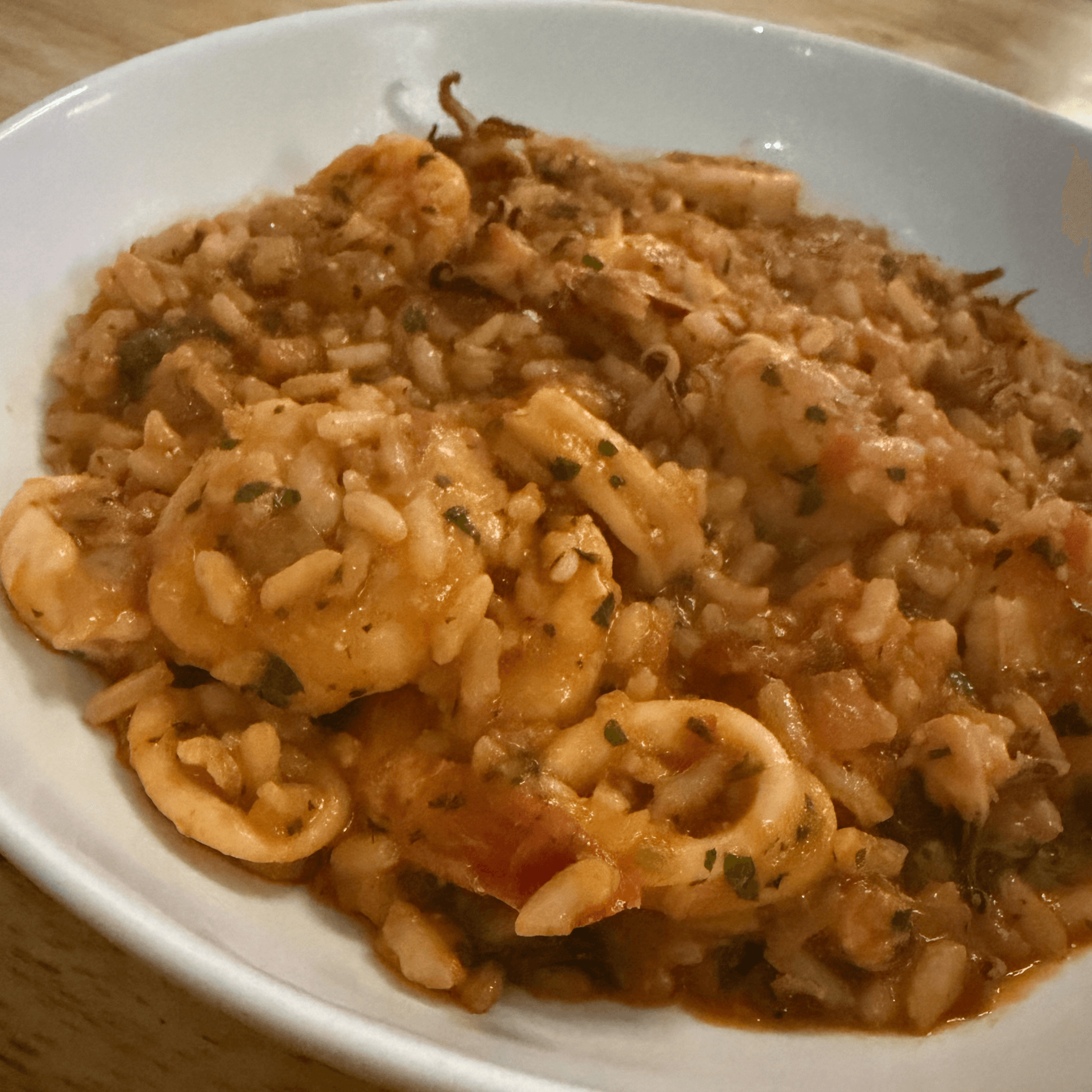 Carnaroli rice, Wild caught domestic shrimp, wild caught domestic Calamari, shrimp stock, Calabrese pepper, touch tomato, parsley.