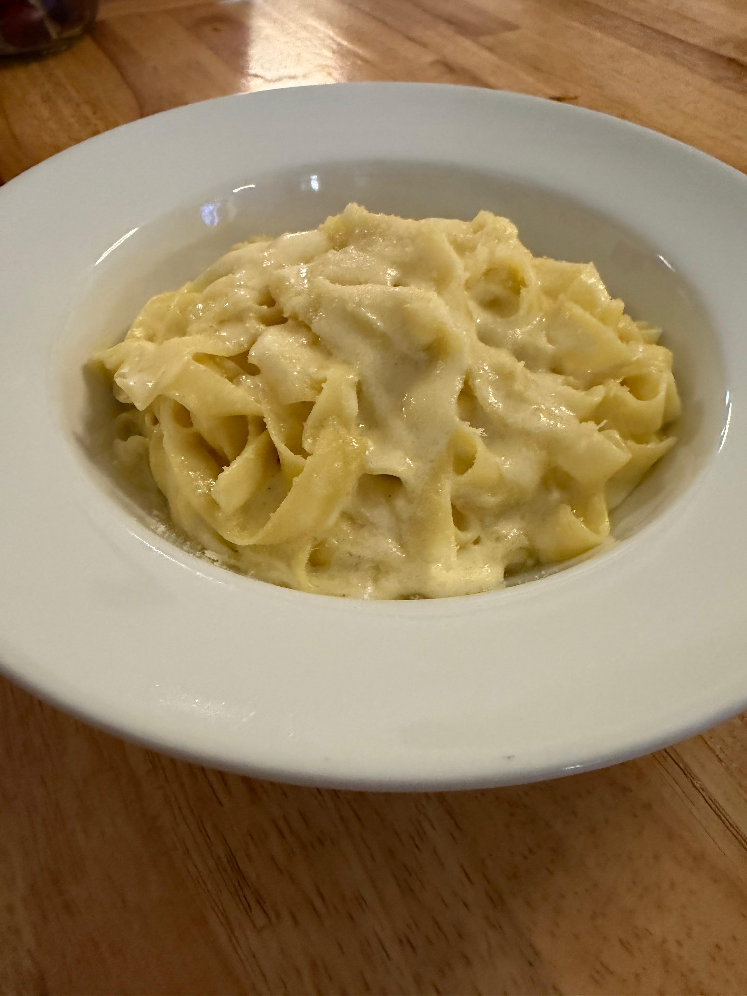 Homemade Fettuccine pasta, tossed in a rich Pamigiano cream sauce.