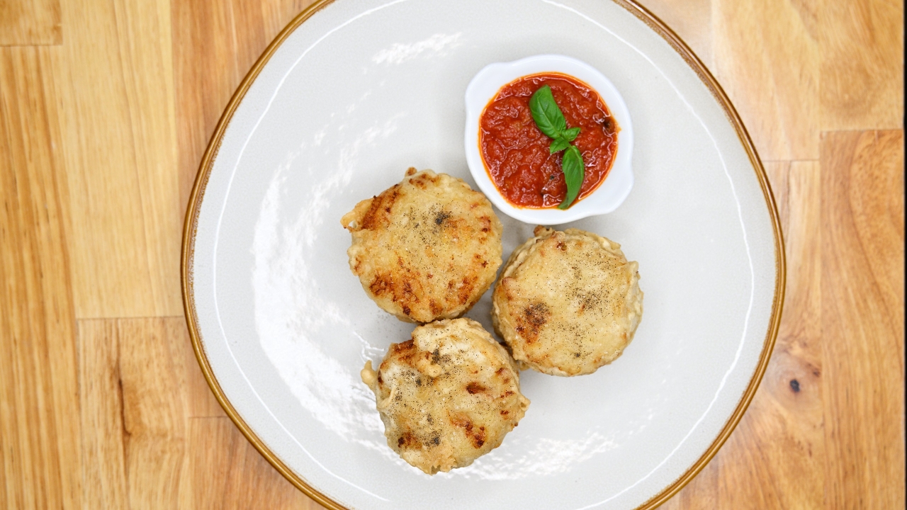 Bucatini pasta, Grana Padano, pecorino Romano, black pepper, béchamel sauce with a coating of batter.