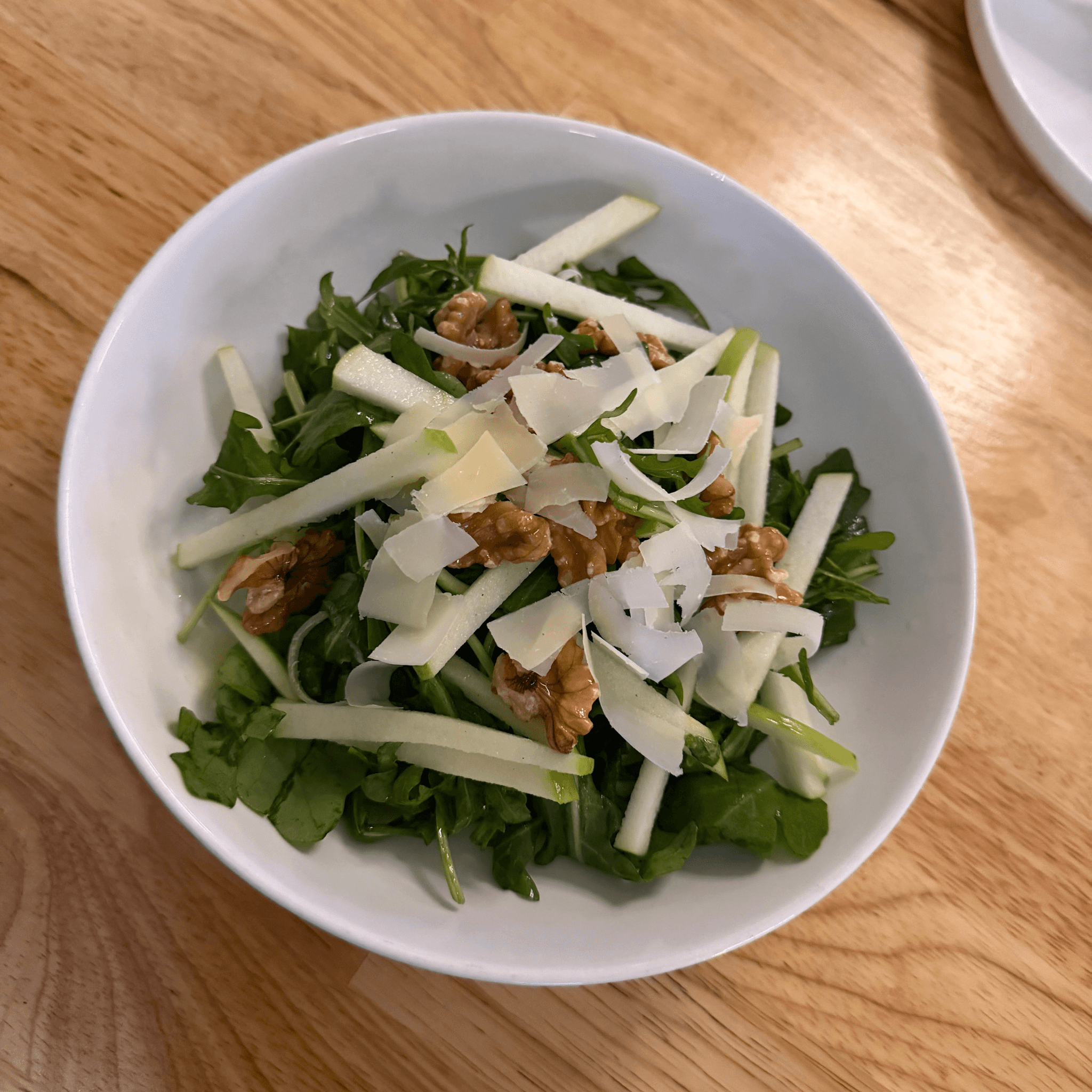 Baby arugula, apple, walnut, Parmigiano Reggiano, lemon dressing.