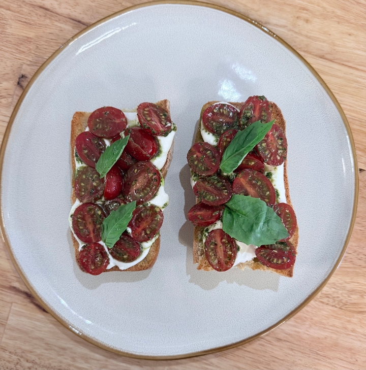 Pomodoro, fresh mozzarella fior di latte, Pecorino Romano, fresh basil, and extra virgin olive oil.