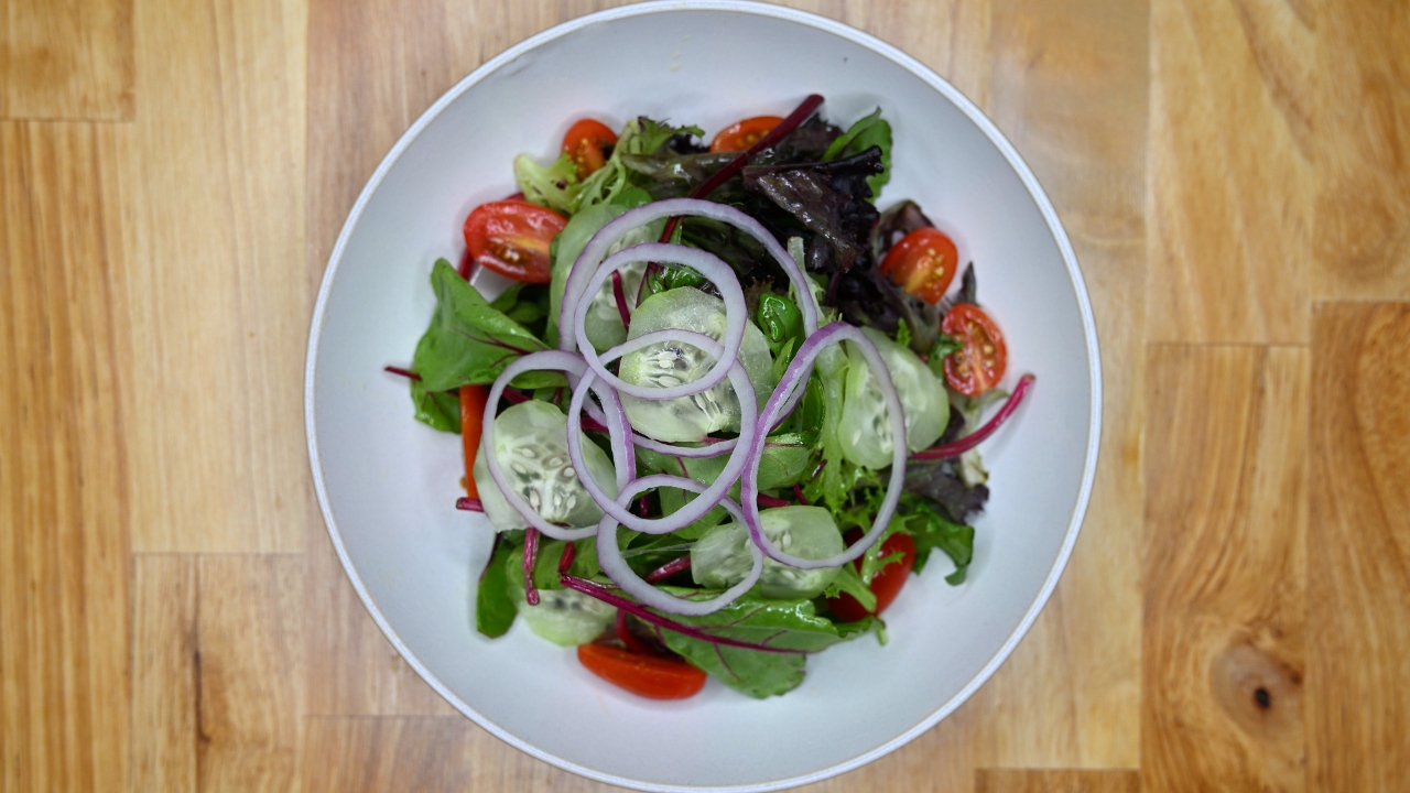 A mix of fresh greens, ripe tomatoes, red onion, and cucumber, tossed in a balsamic vinaigrette.