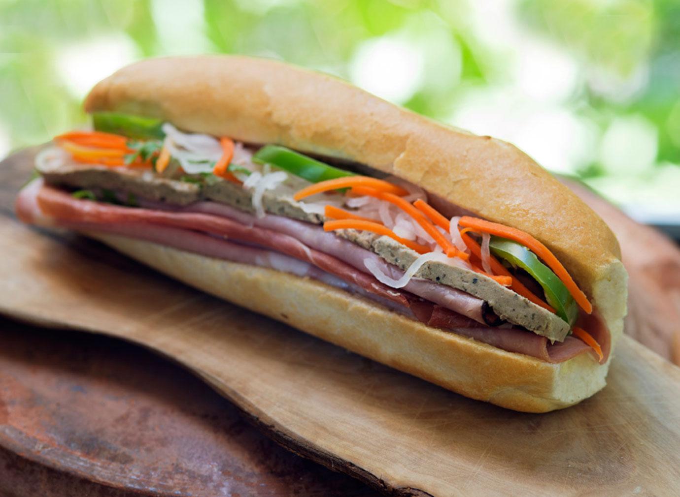 Pork Loaf, Vietnamese Ham, Vietnamese Brawn, Pate, Mayo, Cucumber, carrot/daikon pickles, Cilantro.