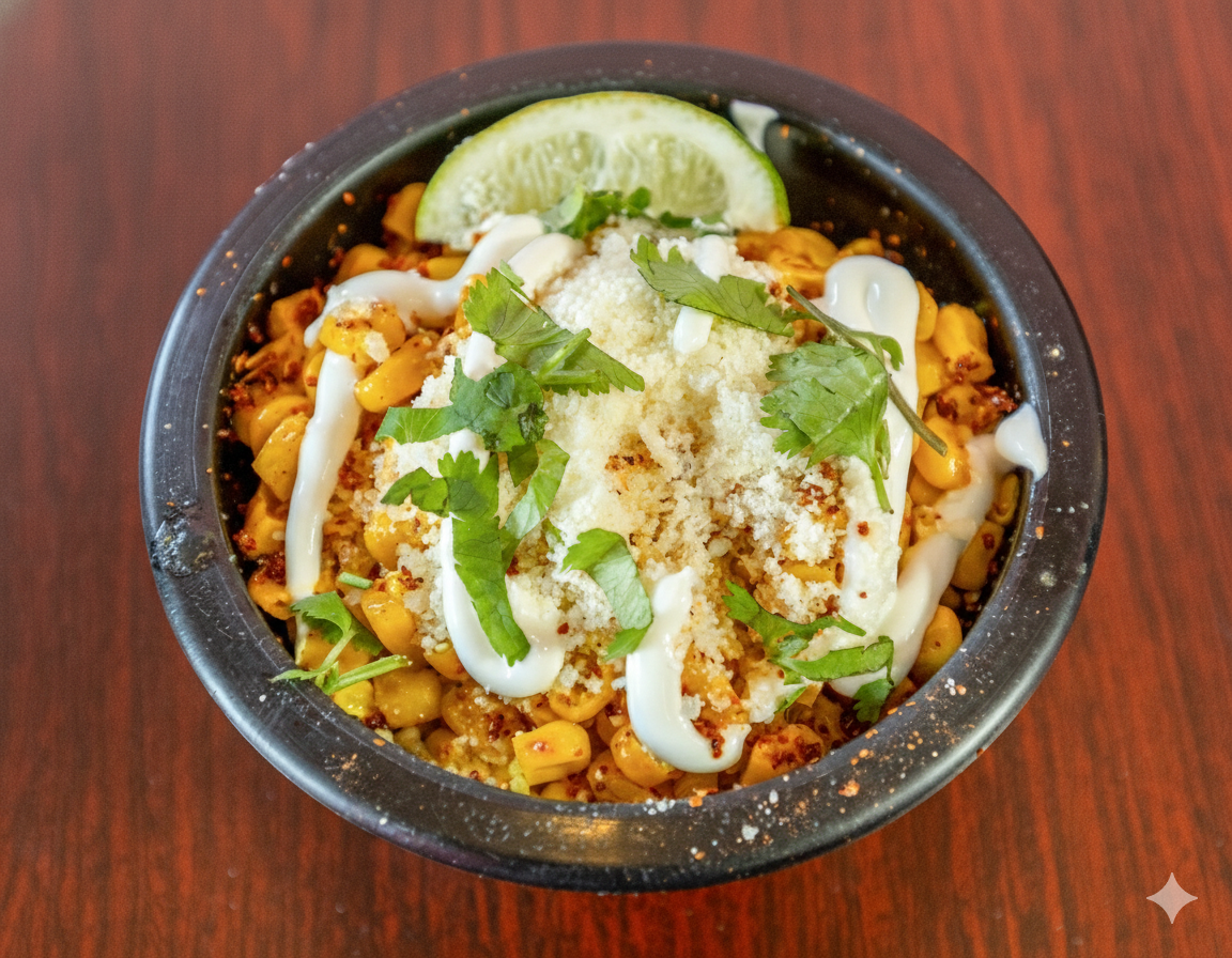 Topped with crema, parmesan cheese, cilantro, and tajin.