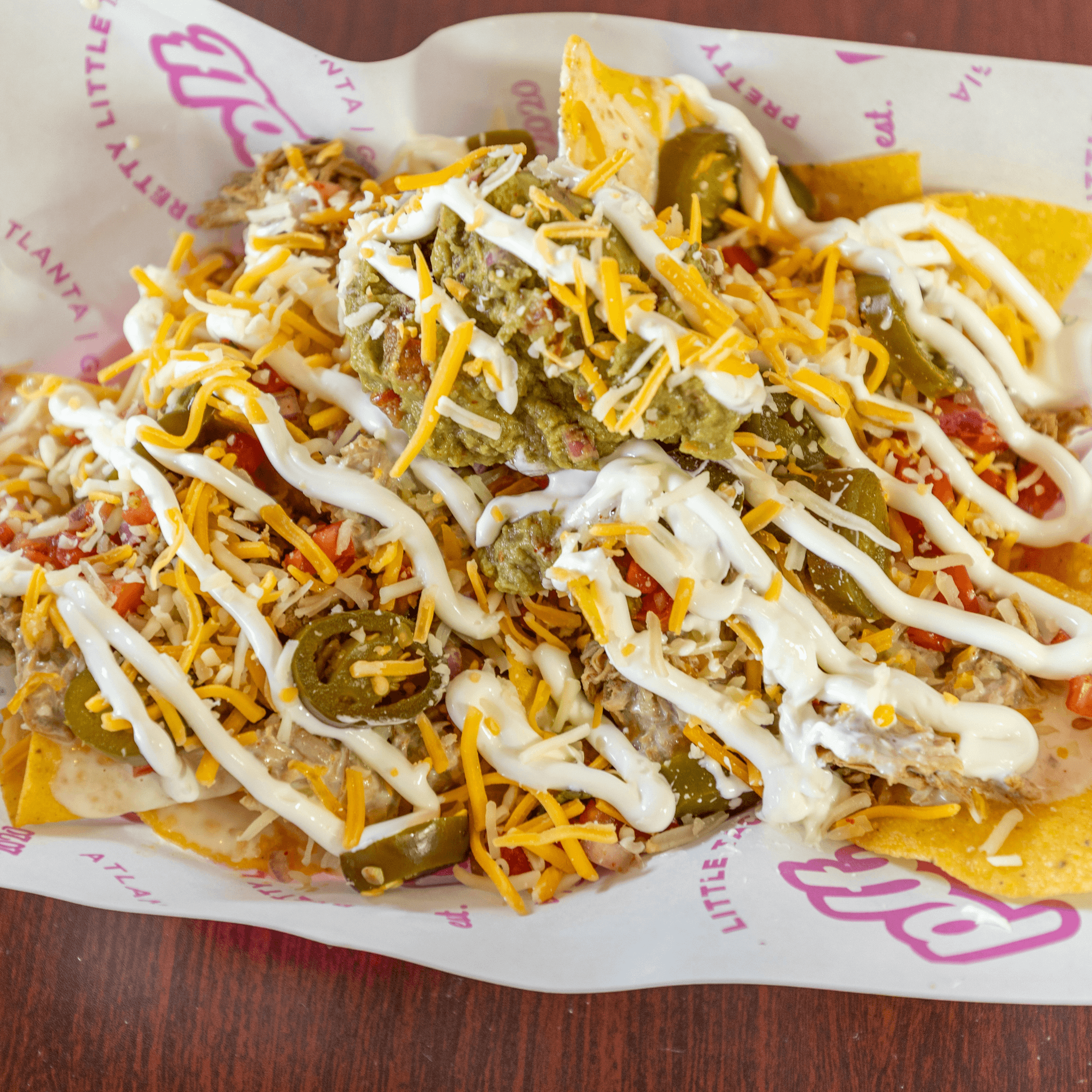 Classic nachos, loaded with queso, shredded cheese, pico, crema, and jalapeños