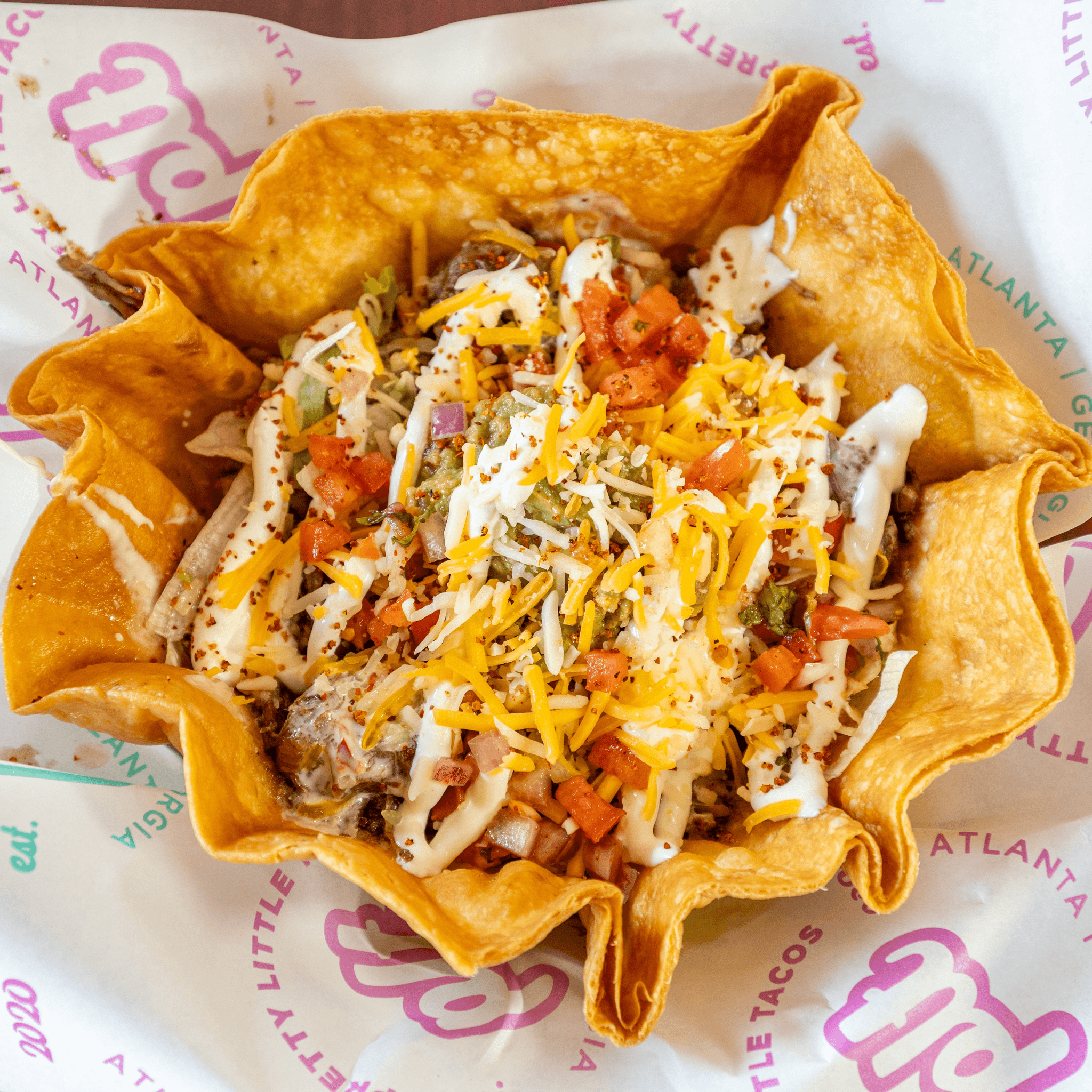 Tacos, but make it salad. A crispy tortilla bowl filled with yellow rice, red beans, pico, shredded cheese, iceberg lettuce, avocado crema, and our house vinaigrette