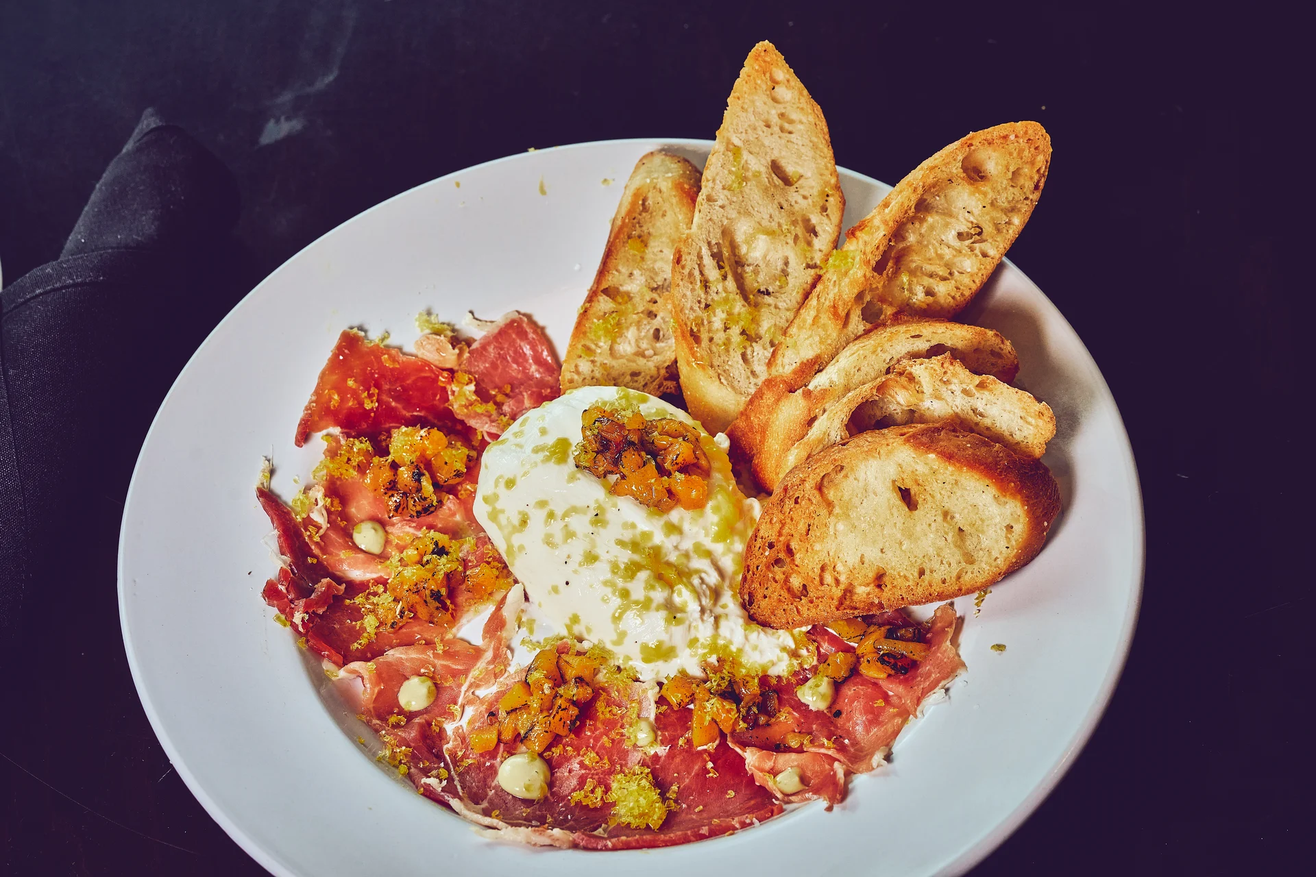Cured Ham, Avocado Puree, Cured Egg Yolk, Toast Points