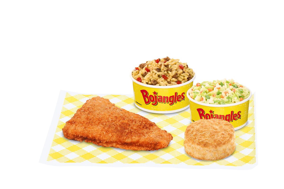 2 chicken breast tenderloins made with bold flavor and served with a made-from-scratch biscuit, a fixin’, and a milk.