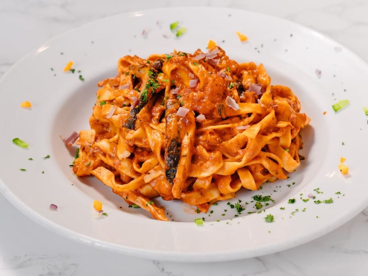 Fettuccine with chicken, prosciutto, and portobello mushrooms in a rose sauce.
